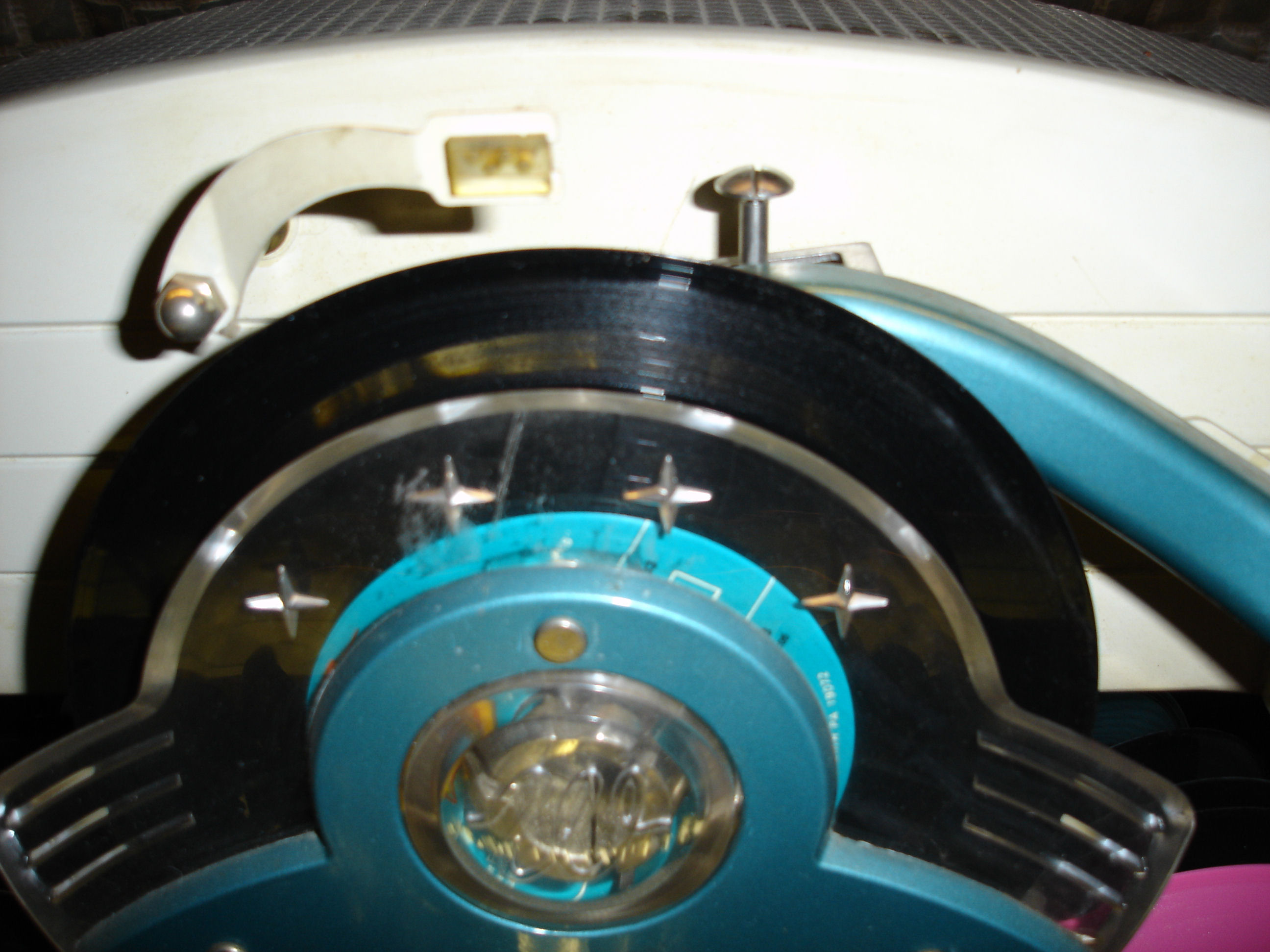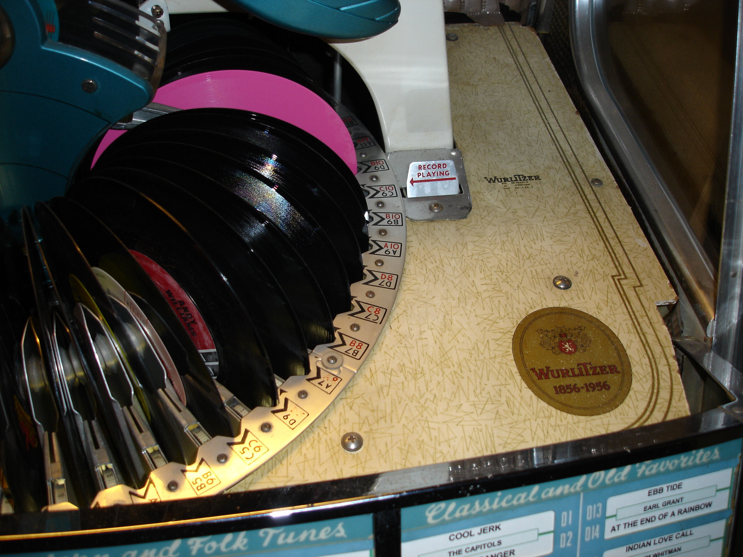 centennial anniversary it plays both sides of fifty two 45rpm records making one hundred and four selections,to make a selection you inserted your coins to get credet 5,10c or a quarter,then you made your selections by pressing a letter and number,the carousel would rotate,and when the selection was lined up with the lifting arms,there were two,one on the left and right side of the mech the record would lift from the carousel up towards the turntable,side A of the record would lift from the left side,and side B would lift from the right side,when the record was lined up with the turntable,the turntable would clamp the record and the tone arm would play the record on its side.