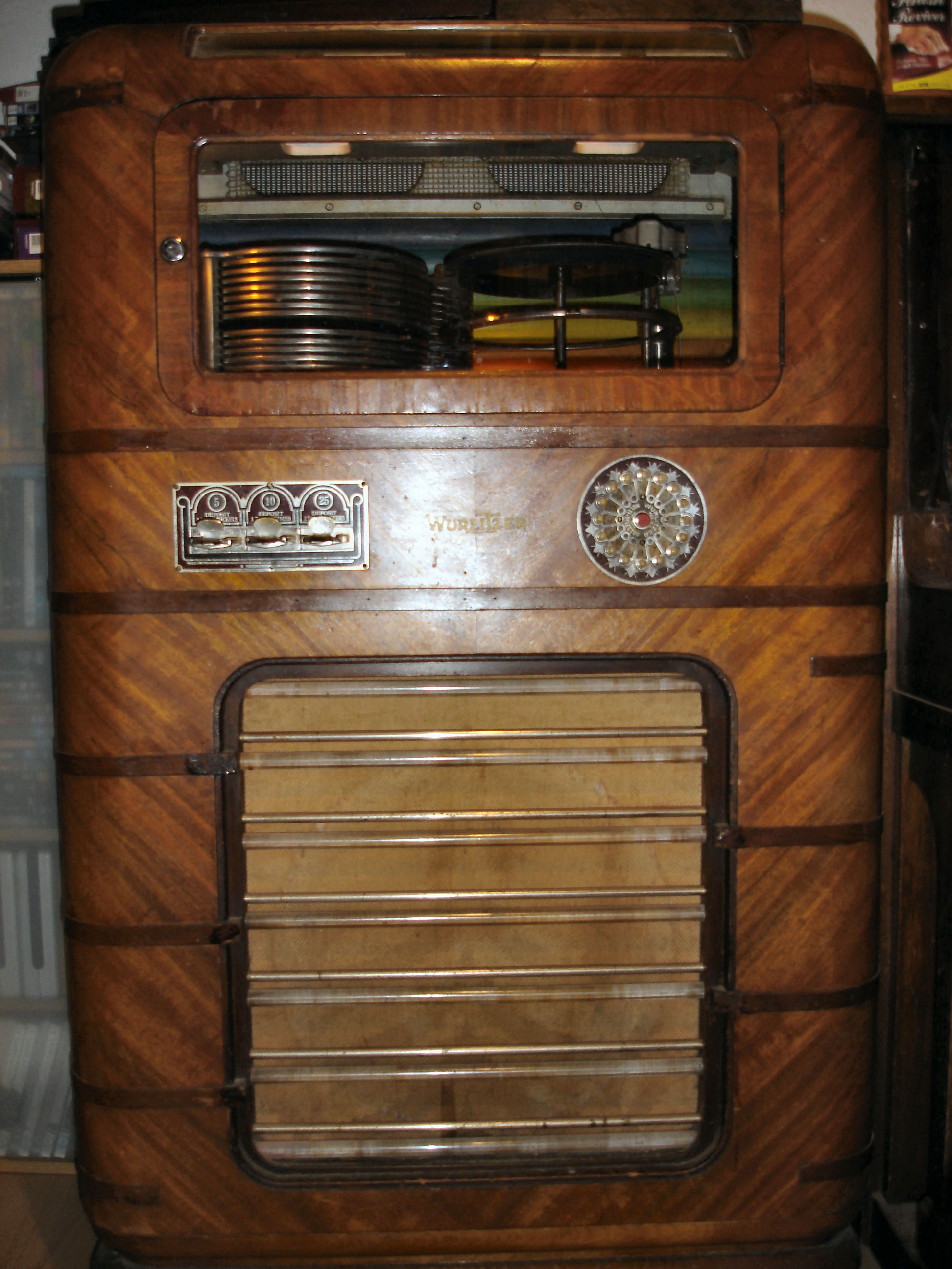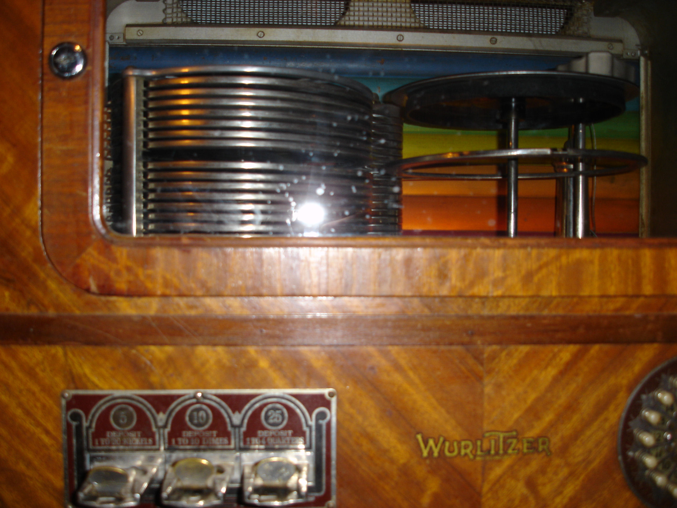 This Jukebox was produced in 1936/37 and was one of the 16 selection simplex models produced at this time,to make a selection you pressed one or more of the butttons on the rotary selector on the front of the machine then you inserted your coins 5c for one play,10c for two plays and a quarter for five plays the mech would then kick out the required tray and the turntable would rise to meet the disc and bring it up to the tone arm.The lighting is interesting as it was produced before the light up jukeboxes,the back of the mech is lit by a single bulb onto a rainbow painted board,at the front accros the speaker has lucite bars lit by six bulbs.