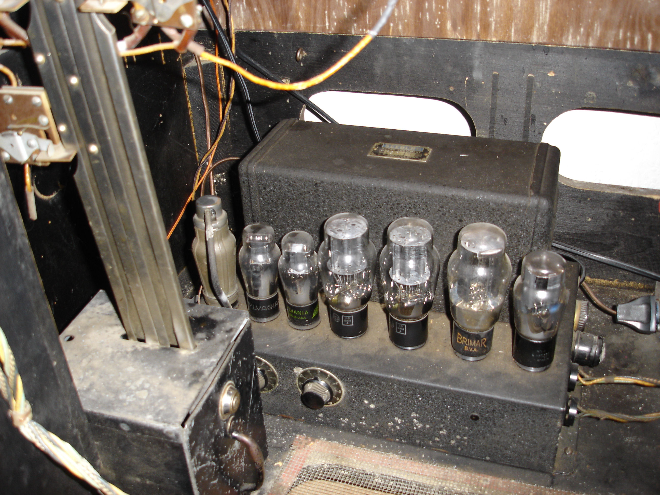 The amplifier has 7 valves/tubes (57,2x56,80,5Y3,2x2A3) The 57 is used as a preamp for the moving vain pickup,the two 56`s are conected in paralell and used to drive a phase splitting transformer,which in turn drives the push pull output stage using two 2A3 output triodes which drives via output transformer two speakers,one which is a high frequency speaker,the 5Y3 rectifier is used for the HT etc ,and the 80 is used for biasing the two directly heated 2A3`s