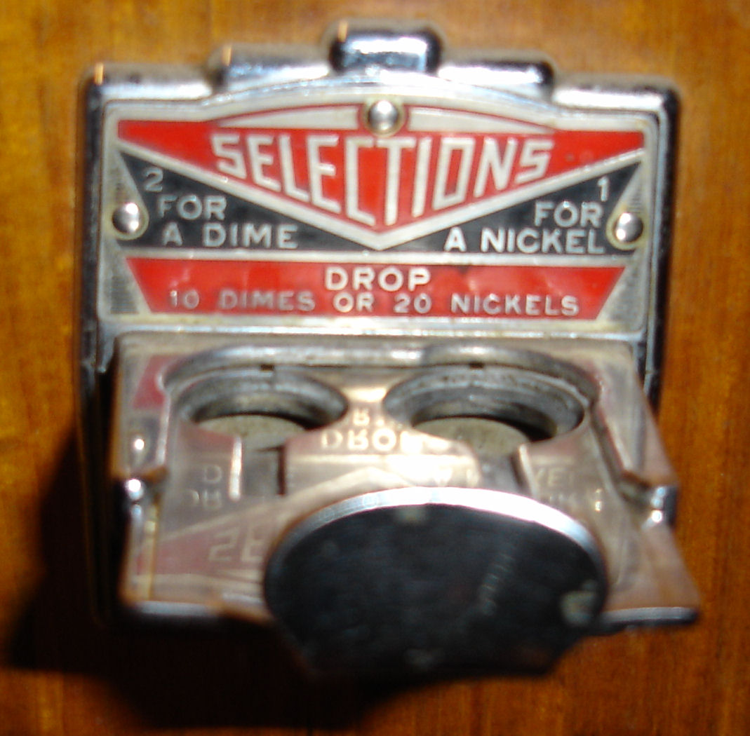 This Jukebox is a Seeburg Synphanola Model D,It was produced in 1936 it has 12 selections,It looks like the previous model C but uses a different amplifier and has an extra speaker for high frequencies.You make your selection by turning the knob to the requied selection and then insert a nickel (5c Coin) for one tune or a dime (10c coin) for two tune`s,the record (which is located on the left hand side,in a stack of sliding tray`s) slid`s over to the right hand side,and the the turntable rises and picks up the record from the tray and on to the pickup.