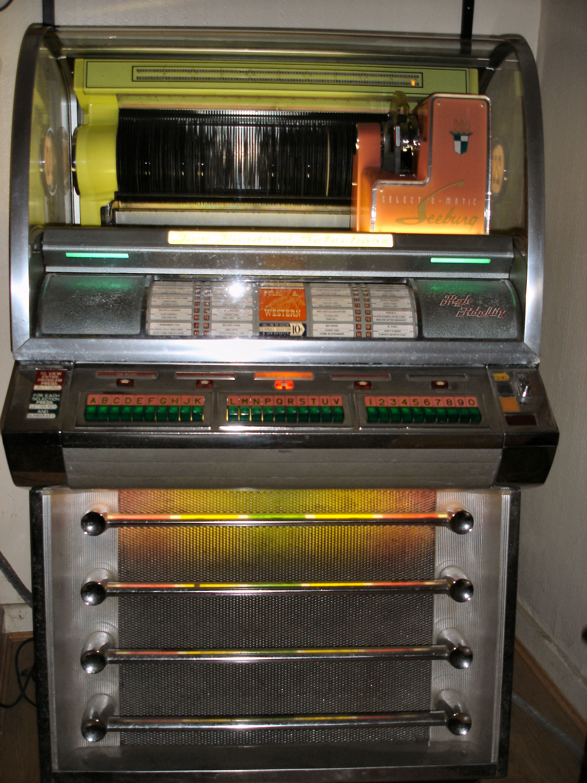 This Jukebox was produced in 1956/57 by seeburg it plays both sides of one hundred 45rpm records,making 200 selections,it and its sister the V200 were the first jukebox to have 200 selections,it is also the first jukebox to use electronic computer know how from that time.The records were stacked verticaly from one end of the box to the other end and when you made a selection the whole playing mechenism moved from one end of the record stack to the other and back again,when it reached the required selection it stopped and would pull the record from the stack and clamp it onto the turntable,and the tone arm then played the record.On the front of the jukebox there was not enough space to put all the title`s for the records,so they used a revolving drum which is divided into five segments,with twenty title strips per segment,there are five red buttons which when pressed turn the drum to the required segment.This jukebox has one of the best soud from this era.
