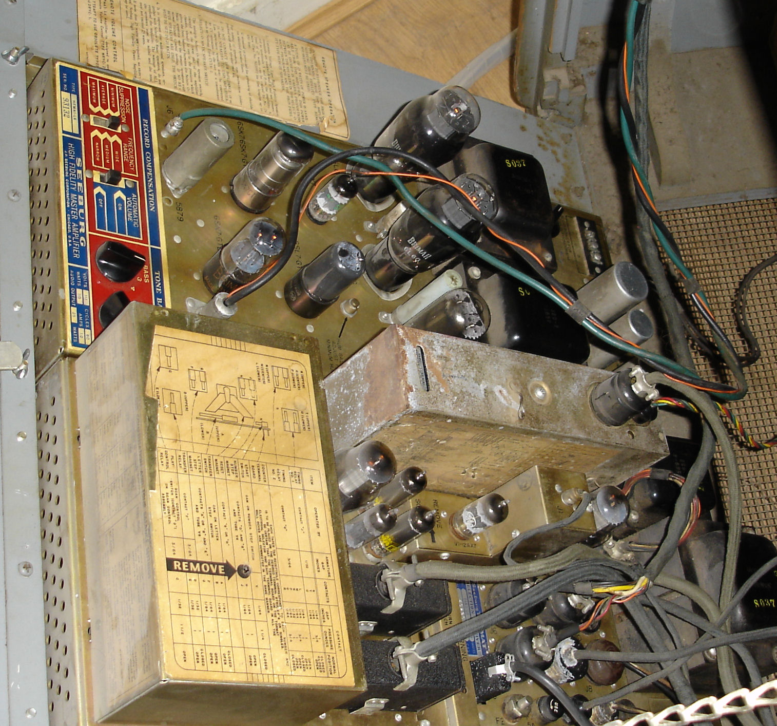 The amplifier had 8 Valves/tubes (5879,6SN7,6SK7,6SL7,12AX7,2x6L6,5U4) The 5879 is used as a preamp for the magnetic pickup this fed into 6SN7 half used for amplification and the other as a cathode follower for volume bass an treble controls,this is fed throgh an automatic volume control circuit (6SK7,6SL7),which is fed to a 12AX7 which is used as a phase splitter which is fed to 2x6L6`s output valves which fed a ultra linier pushpull output transformer which fed four speakers,two 12" bass and two 8" tweeters.